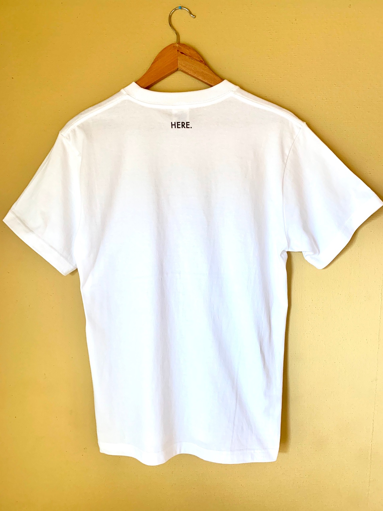 多重露光の写真作品をコンパイルしたZINE、2020年作の"ZANZO"と1986年作の"ZANKYO"を収録した透明ヴァイナルの7インチシングルとフォトカードがセットになった白石隆之の作品集dʌ́b[ダブ]のヴィジュアルを落とし込んだTシャツシリーズ。フロントにZINEの写真作品、バックの襟下にHERE.のロゴをプリント。セミコーマ糸を使用した適度な厚みがある5.6ozの100%コットンTシャツです。